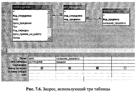 Запрос на SQL, соответствующий запросу, изображенному на рис. 7.6, будет выглядеть следующим образом: