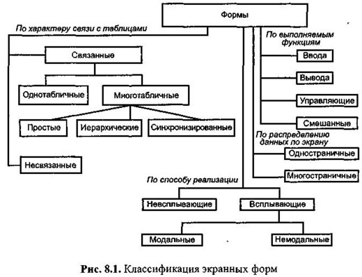 Экранные формы можно классифицировать (рис. 8.1) по ряду признаков.