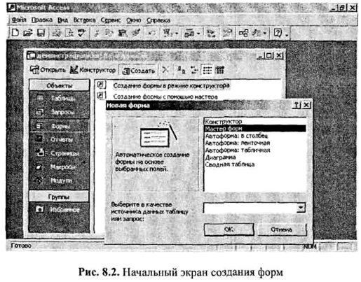 Форму можно создавать несколькими способами. Для того чтобы создать новую форму, необходимо выбрать вкладку Формы в окне базы данных и щелкнуть по кнопке Создать - появится окно Новая форма (рис. 8.2).