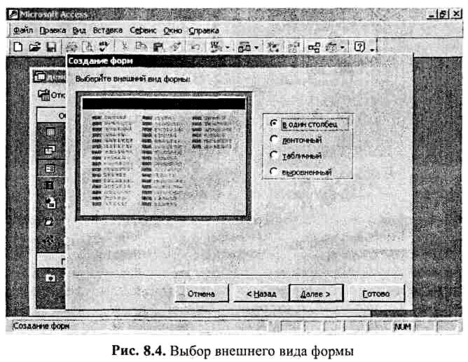 После определения состава полей, включенных в форму, следует выбрать внешний вид формы (рис. 8.4). Удобнее сначала выбрать вид «в один столбец» 11, а затем разместить элементы формы по экрану так, чтобы это было удобно для последующей работы с формой.