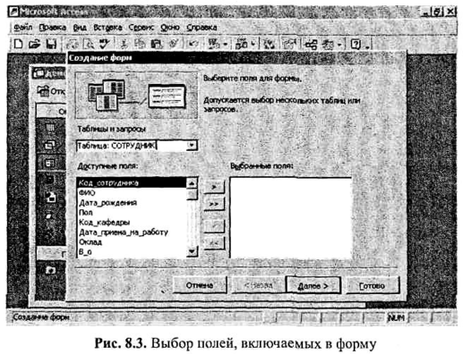 Следующим шагом при создании форм является выбор полей, которые будут включены в экранную форму (см. рис. 8.3). Поля могут переноситься в форму по одному и все сразу. В первом случае необходимо позиционироваться на нужное поле и щёлкнуть по кнопке с одинарной стрелкой, направленной вправо. Чтобы перенести все поля, следует воспользоваться кнопкой с двойной стрелкой. Поля, включенные в форму, на этапе определения состава полей можно исключить, воспользовавшись кнопками со стрелками, направленными влево.