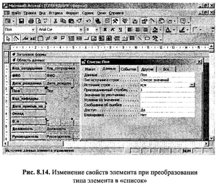 Но в некоторых вариантах преобразования необходимо выполнить дополнительные шаги для того, чтобы достичь желаемого результата. Так, например, если обычное поле преобразовать в «список» или «поле со списком», то автоматически список значений или связь с полем подстановки не появится. Поэтому следует соответствующим образом изменить свойства элемента. Для этого нужно позиционироваться на нужном элементе и щелкнуть по кнопке Свойства. Например, если мы хотим сделать элемент «Пол» списком с фиксированным набором значений «м» и «ж», то в поле «Тип источника строк» нужно выбрать «Список значений », а в качестве источника строк через точку с запятой указать «м» и «ж» (рис. 8.14).