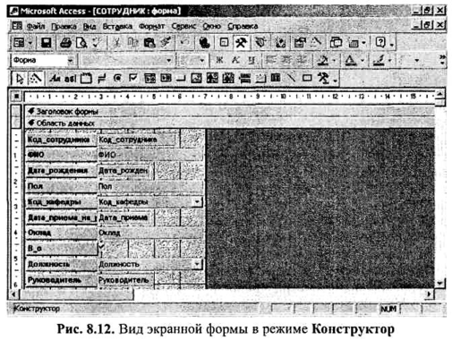 Как отмечалось выше, форма, созданная Мастером, может быть скорректирована. Для этого необходимо одним из указанных ранее способов перейти в режим Конструктор. Экранная форма, полученная с помощью Мастера, в режиме Конструктор будет иметь вид, представленный на рис. 8.12.