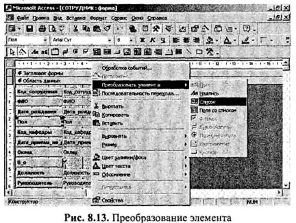 Во-первых, можно изменить тип элемента управления в форме. Для этого в режиме Конструктор необходимо выделить соответствующий элемент формы, щелкнуть правой клавишей мыши и в появившемся контекстном меню выбрать позицию «Преобразовать элемент в...» (рис.8.13).