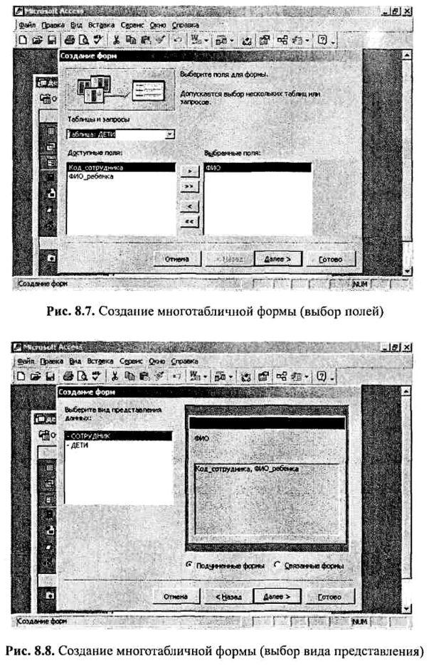 Если при построении многотабличной формы сначала выбрать таблицу, находящуюся на стороне «многие» в отношении «1:М» (в нашем примере это таблица «Дети»), а потом таблицу, находящуюся на стороне «1» (в нашем примере это таблица «Сотрудник»), то многотабличная экранная форма также будет создана, но это будет совсем иная форма, чем та, что изображена на рис. 8.11. Это будет форма, в которой отображаются записи подчиненной таблицы (т.е. таблицы «Дети»), к которым присоединены поля из соответствующей записи основной таблицы. Никакой соподчиненности форм при этом не наблюдается. Создается только одно описание формы, а не два, как в предыдущем случае.