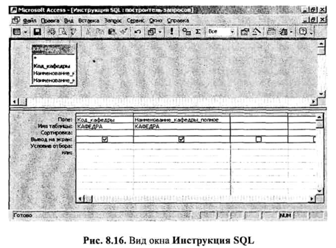 Создаваемый запрос будет зависеть от того, только столбец подстановки будет выводиться на экран или еще и поясняющий его столбец, т.е. в нашем примере столбец «Код_кафедры» и «Наименование_кафедры_полное». В этом случае запрос примет вид, представленный на рис. 8.16.