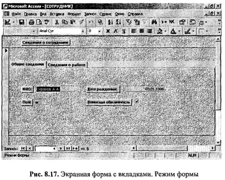 Существует несколько причин, по которым бывает необходимо/ целесообразно разнести данные, размещаемые в экранной форме, по нескольким страницам. Это может быть в случае, когда элементов в форме много и размещение всех их на одном экране слишком загромождает его; либо может быть вызвано желанием сгруппировать поля и показывать каждую группу отдельно и др. Для достижения этих целей можно, воспользовавшись элементом управления Разрыв страницы, указать, в каких местах должен быть переход на следующую страницу, или создать форму с несколькими вкладками (рис. 8.17).