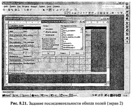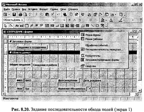 Последовательность обхода полей при работе с формой может отличаться от их расположения на экране. Для установления этой последовательности можно, позиционировавшись на заголовок окна формы в режиме Конструктор, нажать на правую клавишу мыши. При этом появится всплывающее окно (рис. 8.20), в котором следует выбрать позицию Последовательность перехода....
