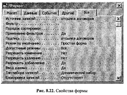 Кроме свойств, присущих каждому отдельному элементу формы, имеются свойства, относящиеся ко всей форме. Их можно с успехом использовать для создания дополнительных удобств при работе с формой, для обеспечения целостности базы данных и других целей. Для того чтобы посмотреть/скорректировать свойства формы, надо открыть форму в режиме Конструктор и двойным нажатием кнопки мыши на области выделения формы открыть окно свойств формы. Перечень свойств формы обширен. Рассмотрим некоторые из них. Так, на вкладке Данные (рис. 8.22) имеется свойство «Ввод данных». Если выбрать для него значение Да, то можно создать форму, использующуюся только для ввода данных. В этом случае в форме будет высвечиваться одна пустая запись, в которую можно вводить новые данные. Если нужно, чтобы выводились все записи, значение этого свойства должно быть Нет.