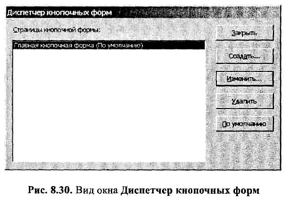 Если кнопочная форма создается в данном приложении впервые, то выдается сообщение «Не удается найти кнопочную форму в этой базе данных. Создать кнопочную форму?», на которое следует ответить Да, после чего появится окно Диспетчер кнопочных форм (рис. 8.30).