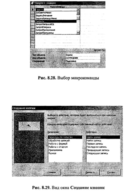 Для создания кнопки можно воспользоваться и Мастером кнопок. Для этого кнопка Мастер на панели элементов должна быть нажата. В этом случае при использовании элемента Кнопка откроется окно Создание кнопок (рис. 8.29). В появившемся окне можно выделить несколько зон. Прежде всего это два списка: Категории (фактически означающие группы действий) и Действия, относящиеся к каждой из этих категорий. Слева высвечивается рисунок, соответствующий выбранному действию.