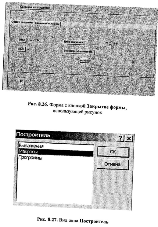 Далее необходимо поставить в соответствие кнопке действие, которое будет выполняться при щелчке по этой кнопке. Для этого можно, например, выбрать свойство «Нажатие кнопки». Щелкнув по кнопке с многоточием в этой строке, попадаем в окно Построитель (рис. 8.27). Для своей кнопки выберем позицию Макросы, затем - макрокоманду Закрыть, указав при этом тип и имя объекта (рис. 8.28).