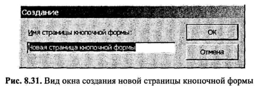 Первоначально кнопочная форма не содержит никаких элементов. Для того чтобы продолжить работу по созданию кнопочной формы, необходимо сначала концептуально определить, как будет выглядеть наша кнопочная форма. Если это будет одноуровневая форма, которая включает кнопки, соответствующие конечным действиям, то следует щелкнуть по кнопке Изменить... и внести в нее необходимые элементы. Если создаваемый интерфейс будет многоуровневым, при котором выполняемые функции будут сгруппированы и каждая группа кнопок будет размещаться на отдельной странице кнопочной формы, то необходимо создать эти дополнительные страницы с помощью кнопки Создать.... Предположим, что мы хотим сгруппировать выполняемые функции и создать три кнопочные формы второго уровня: «Ввод данных», «Корректировка данных» и «Отчеты». Создадим эти новые страницы, воспользовавшись кнопкой Создать... -появится окно Создание (рис. 8.31), в котором следует задать имя новой страницы кнопочной формы.