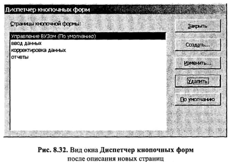 После создания трех требуемых нам страниц диалоговое окно Диспетчер кнопочных форм приобрело вид, представленный на рис. 8.32.