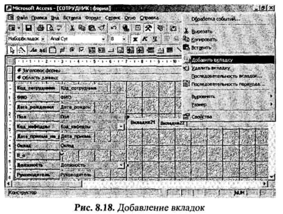 При выборе этой возможности в форме создаются две вкладки. В каждую из них можно переместить необходимые элементы. Если требуется создать большее число вкладок, то следует, находясь в зоне вкладок, нажать правую клавишу мыши и в появившемся контекстном меню выбрать позицию Добавить вкладку (рис. 8.18). Для включения элементов нужно выбрать необходимую вкладку и щелкнуть по кнопке Список полей на панели инструментов. Из появившегося ниспадающего списка следует выбрать имя нужного поля, позиционировавшись на нем, нажать левую клавишу мыши и, не отпуская ее, переместить элемент в нужное место вкладки.