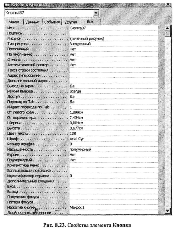 После этого следует, позиционировавшись на этой кнопке, нажать правую кнопку мыши и в появившемся контекстном меню выбрать позицию Свойства. Кнопка имеет большой набор свойств (рис. 8.23). Набор этих свойств так велик, что весь не умещается на экран. Рассмотрим некоторые из этих свойств.