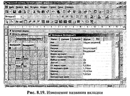Для того чтобы изменить название вкладки, необходимо воспользоваться правой кнопкой мыши, в появившемся контекстном меню выбрать позицию Свойства и в свойстве «Имя» записать требуемое название (рис. 8.19).