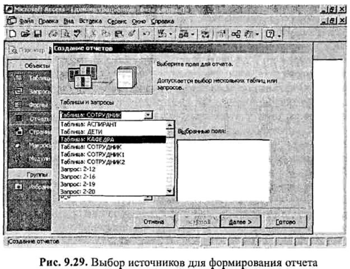 В нашем примере в качестве источника для отчета использовалась одна таблица. Часто требуется ввести в отчет данные из нескольких таблиц. Даже в нашем примере желательно выводить в отчете не код кафедры, а ее наименование. Сделать это можно несколькими способами. Во-первых, можно выбрать несколько источников на том шаге создания отчета, на котором выбираются поля в отчет (см. рис. 9.6). Таблицы следует выбирать в порядке их соподчиненности (т.е. по .цепочке 1:М). В нашем случае сначала нужно выбрать таблицу «Кафедра» (рис. 9.29), выбрать поля из этого источника и далее, не переходя к следующему шагу, выбрать таблицу «Сотрудник» и ее поля. В этом случае группировка по кафедре будет создана автоматически. На последующих шагах проектирования отчета можно как отказаться от этого уровня группировки, так и создать новые уровни.