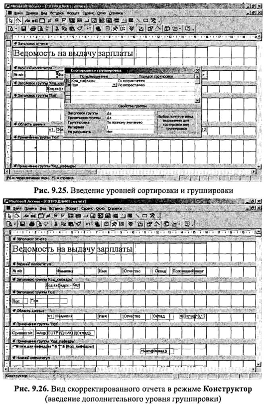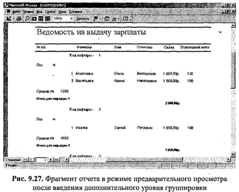 Для получения желаемого результата поместим поле «Пол» в данном списке на вторую позицию. В итоге в отчете появятся две дополнительные зоны. В зону заголовка группы «Пол» перенесем подпись соответствующего поля и само поле, а в примечание группы «Пол» включим вычисляемое поле, отражающее среднюю зарплату. Отчет в режиме Конструктор теперь имеет вид, представленный на рис. 9.26. Фрагмент этого документа в режиме предварительного просмотра приведен на рис. 9.27.