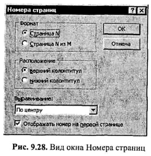 В окне Номера страниц (рис. 9.28) выбрать параметры, определяющие формат, расположение и выравнивание номеров страниц.