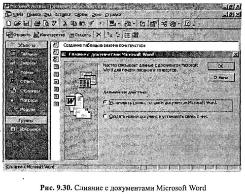 Если выбрать вариант 1, то можно создавать документы Word, в которые включаются значения полей из выбранной таблицы. После выбора этого варианта откроется соответствующее окно (рис. 9.30).