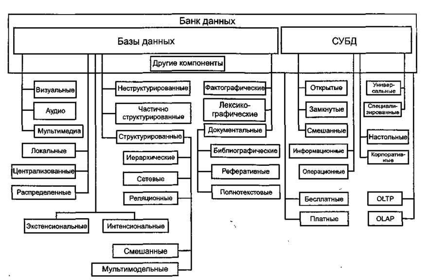Банки данных являются сложными системами, и их классификация может быть произведена как для всего банка данных в целом, так и для каждого его компонента отдельно; классификация для каждого компонента может быть проведена по множеству разных признаков (рис. 1.13).