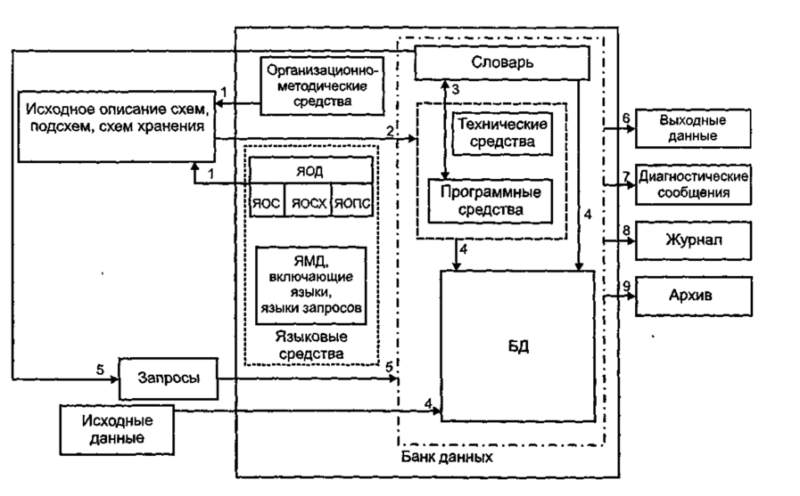 На рис. 1.12 представлена упрощенная схема взаимодействия компонентов БнД в процессе создания и эксплуатации системы. Создание БД начинается с проектирования БД и ее описания на ЯОД (1). На этапе проектирования структуры БД могут использоваться как методики ручного проектирования, так и CASE-средства, автоматически генерирующие описания БД. Полученные описания должны быть введены в БнД и запомнены в соответствии с требованиями конкретной СУБД (2,3). После того как описание базы данных сохранено, в базу данных могут вводиться данные (4). При этом СУБД использует метаинформацию, зафиксированную в словаре данных. Заполненная БД может использоваться для извлечения из нее нужной пользователям информации (5). При формулировании запросов используется информация, содержащаяся в схемах и подсхемах. В результате выполнения запроса выходные данные в том или ином виде выдаются пользователю (6). Кроме собственно затребованных данных при выполнении операций с БнД часто выдается диагностическая информация (7). Для обеспечения надежности функционирования БнД необходимо выполнять соответствующие процедуры, в частности осуществлять журнализацию (8) выполняемых действий с БД, регулярно архивировать данные (9).