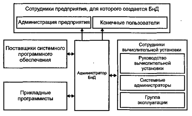 Администраторы БнД взаимодействуют также с внешними по отношению к нему группами специалистов, и, прежде всего поставщиками СУБД и ППП, администраторами других БнД.