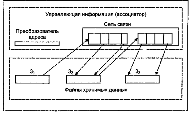 Отдельное место среди структурированных систем занимают системы, построенные на использовании инвертированных файлов. Особенность организации данных в них состоит в том, что собственно хранимые данные и информация о связях между информационными единицами логически и физически отделены друг от друга. Основные данные в этих системах хранятся в файлах, записи которых могут иметь сложную структуру. Вся управляющая информация сосредоточена в ассоциаторе. Логическая связь между файлами устанавливается посредством компонента ассоциатора, называемого сетью связи. На рис. 1.17 схематически представлен принцип установления связей в таких системах. Реально связи устанавливаются не непосредственно с элементами связи, как это изображено на рисунке, а через преобразователь адреса. В системах, построенных на инвертированных файлах, можно передавать связь типа М: М (многие ко многим) между записями файлов, что не позволяют никакие другие системы. Отделение ассоциативной информации от собственно хранимых данных позволяет изменять связи, не изменяя при этом самих файлов.