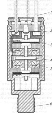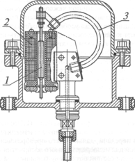 . Его катушки 5 включаются в мостовую схему с помощью подводящих проводов 1, а роль инерционной массы выполняет якорь 4, закрепленный в центрах двух плоских пружин (мембран) 3, выполняющих роль упругого подвеса. Необходимое демпфирование обеспечивается вязкой жидкостью, заполняющей внутреннюю полость корпуса 1.