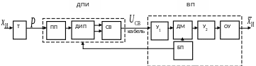На этом рисунке используются следующие обозначения: Т - подводящий трубопровод; ДПИ - датчик первичной информации; ПП - первичный преобразователь; ДИП - дифференциальный индуктивный преобразователь; СВ - схема включения (мост переменного тока); ВП - вторичный прибор; У1 - усилитель переменного тока; ДМ - демодулятор; У2 - усилитель постоянного тока; ОУ отсчетное устройство; БП - блок питания. Отказ любого из этих элементов приводит к отказу всего прибора.