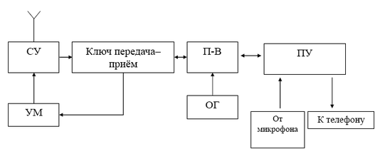Колебания опорного генератора (ОГ), в составе которого имеется высокостабильный кварцевый генератор, поступают в приемник-возбудитель (П-В) для образования сетки рабочих частот. В нем же, в зависимости от режима работы, обеспечивается формирование радиосигнала с соответствующим видом модуляции.