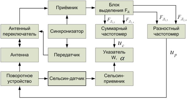 Передатчик запускается синхронизирующими импульсами задающего генератора. Зондирующие сигналы излучаются поддающей антенной. Отраженные сигналы улавливаются приемной антенной, усиливаются, детектируются в приемнике и поступают в блок сопровождения (системы АСД).