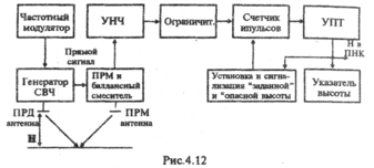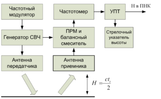 Непрерывные ЧМ колебания, вырабатываемые генератором СВЧ, излучаются передающей антенной по нормали к плоскости движения вниз. Через время tЗ=2H/c (H-высота полета, c-скорость электромагнитных волн) отражаемый сигнал принимается приемной антенной. Частота отраженного сигнала сравнивается с частотой излучаемых колебаний в балансном смесителе приемника.