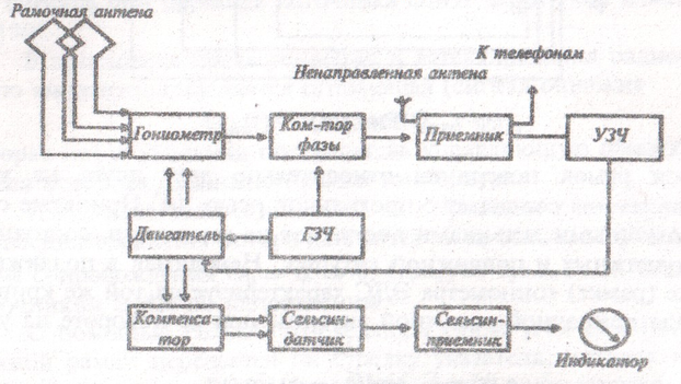 С помощью сельсинно-следящей связи угол поворота подвижной рамки передается на стрелку указателя, которая информирует летчика о курсовом угле пеленгуемой радиостанции.
