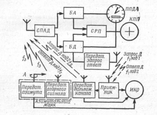 Определение дальности производится как с борта ЛА, так и с земли путем измерения запаздывания ответных сигналов относительно запросных. Запросные импульсные сигналы излучаются бортовым или наземным передатчиком соответственно на частотах f1 и f2 . Ответные импульсы принимаемые бортовым приемником - самолетным приемником, попадают в блок измерения дальности. Где дальность рассчитывается по формуле L=t*C/2.