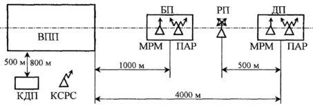 Привод самолетов осуществляется на дальнюю приводную радиостанцию с помощью АРК на расстоянии порядка 200 км. Момент полета над дальней ПАР фиксируется по сигналам маркерного маяка (два тире в секунду) принимаемым маркерным радиоприемником. Управление движением самолетов в районе аэродрома, их взлетом и посадкой осуществляется с командно-диспетчерского /КДП/ или командно-стартового пункта.