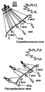 Маневр огнем (рис. 2) заключается в одновременном или последовательном его сосредоточении по важнейшим целям противника или в распределении для поражения нескольких целей, а также в перенацеливании на новые объекты.