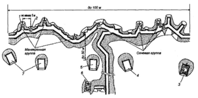 огневая позиция танка; 5 - основная огневая позиция БМП; 6 - укрытие для БМП; 7 - запасные огневые позиции БМП