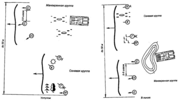 В зависимости от полученной боевой задачи и условий обстановки боевые группы могут наступать в линию, уступом вправо (влево) с интервалом между военнослужащими в боевых группах 6-8 м (8-12 шагов). Для удобства ведения огня и лучшего использования местности военнослужащие в цепи могут выдвигаться несколько вперед или в сторону, не нарушая общего направления фронта наступления и не мешая действиям соседей. Боевая машина пехоты (бронетранспортер) обычно действует за боевыми группами, на одном из флангов отделения или непосредственно в линии боевых групп.