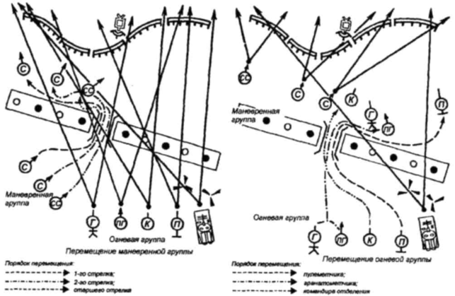 расчетом ведения огня вдоль траншеи в разные направления, продвигается по ее дну, огнем в