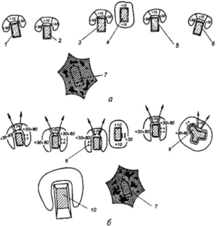 Рис. 3 (начало). Последовательность фортификационного оборудования боевой позиции мотострелкового отделения (вариант): а - устройство одиночных окопов для стрельбы лежа, маскировка БМП (БТР); б - углубление окопов для стрельбы до 1,1 м, устройство ниш для личного состава, окопа для стрельбы из пулемета, начало отрывки окопа для БМП (БТР) на основной огневой позиции; 1 - окоп для стрельбы из автомата (старший стрелок); 2 - окоп для стрельбы из автомата (стрелок); 3 - окоп для стрельбы из автомата (стрелок-помощник гранатометчика); 4 - окоп для гранатометчика; 5 - окоп для стрельбы из автомата (командир мотострелкового отделения); 6 - окоп для стрельбы из пулемета; 7 - БМП (БТР) замаскированная; 8 - ниша на одного человека; 9 - окоп для стрельбы из пулемета стоя; 10 - окоп для БМП (БТР) на основной огневой позиции в стадии отрывки