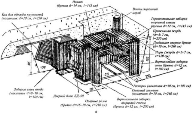 Рис. 24. Блиндаж безврубочной конструкции: а - общий вид; б - продольный разрез