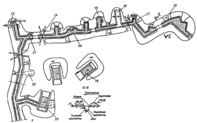 мотострелкового отделения (вариант): г - углубление траншеи до 1,1 м, устройство запасных бойниц и площадки для пулемета, примкнутых ячеек, перекрытых бойниц, блиндажей (перекрытых щелей), ниш для боеприпасов, отрывка окопов для БМП (БТР) на запасных огневых позициях, отрывка хода сообщения к КНП взвода и далее в тыл, маскировка, отрывка укрытия для БМП (БТР) и хода сообщения к нему, фортификационное совершенствование боевой позиции; 13 - перекрытая бойница; 14 - бойница для гранатомета; 15 - вынесенная ячейка для гранатомета; 16 - перекрытая щель (блиндаж); 17 -примкнутая ячейка для фронтального огня; 18 - бойница для фронтального огня; 19 - окоп для БМП (БТР) на запасной огневой позиции; 20 - запасная пулеметная площадка; 21 - примкнутая ячейка для флангового огня; 22 - отхожее место; 23 - укрытие для БМП (БТР) с перекрытой щелью (блиндажом)