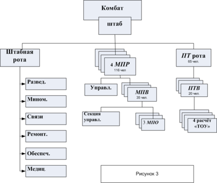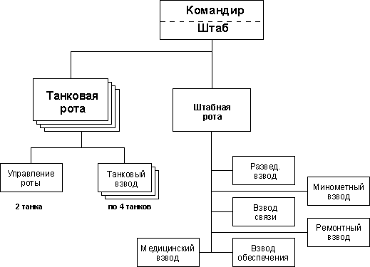 подразделением. Он состоит из: - командования и штаба; - штабной роты; - четырех мотопехотных рот; - противотанковой роты.