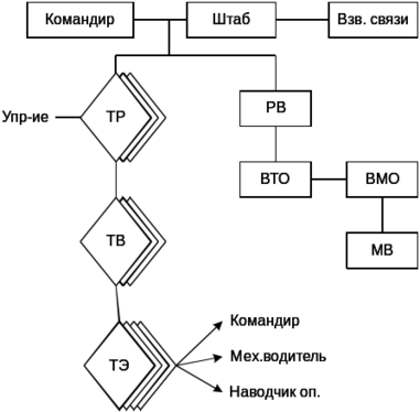 ТВ: ком, 4 танк. экипажа. ТВ имеет 12 ч л/с, 4 танка. Танковый экипаж первичное подразделение танковых войск действующее в составе взвода и в отдельных случаях самостоятельно. Танковый экипаж имеет 1 танк и 3 ч л/с: ком., механник-водитель, наводчик.