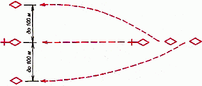 2. Танковый взвод (мотострелковый, гранатометный, противотанковый взвод при действиях на боевых машинах) из колонны в боевой порядок развертывается по команде (сигналу) «Взвод, в направлении такого-то предмета (на такой-то рубеж) - К БОЮ» или «Взвод, за мной - К БОЮ». Машина командира взвода продолжает движение в указанном направлении, вторая машина выдвигается вправо, третья - влево, и, выдерживая равнение по машине командира взвода, с интервалом до 100 м между машинами продолжают движение (рис.2).