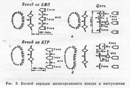 Боевой порядок мотострелкового взвода в наступлении при действиях на БМП (БТР) и танкового взвода состоит из боевой линии боевых машин и средств усиления.