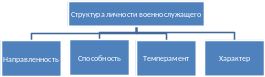 Чтобы понять психологию военнослужащего, его необходимо воспринимать как полноправного гражданина государства, представителя определенного слоя общества, члена воинского коллектива, выполняющего конституционный долг по защите своего Отечества. В то же время личность воина - это также и его индивидуально-психологические особенности, свойства и доминирующие психические состояния. При этом в структуру личности, как правило, включаются ее направленность, характер, способность и темперамент (схема 1).