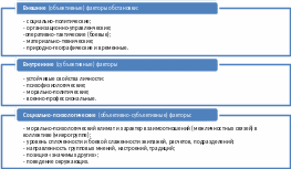 Факторы, влияющие на боевую деятельность военнослужащих, условно можно разделить на две основные группы: внешние и внутренние. Кроме этого, ряд факторов целесообразно отнести к социально-психологическим